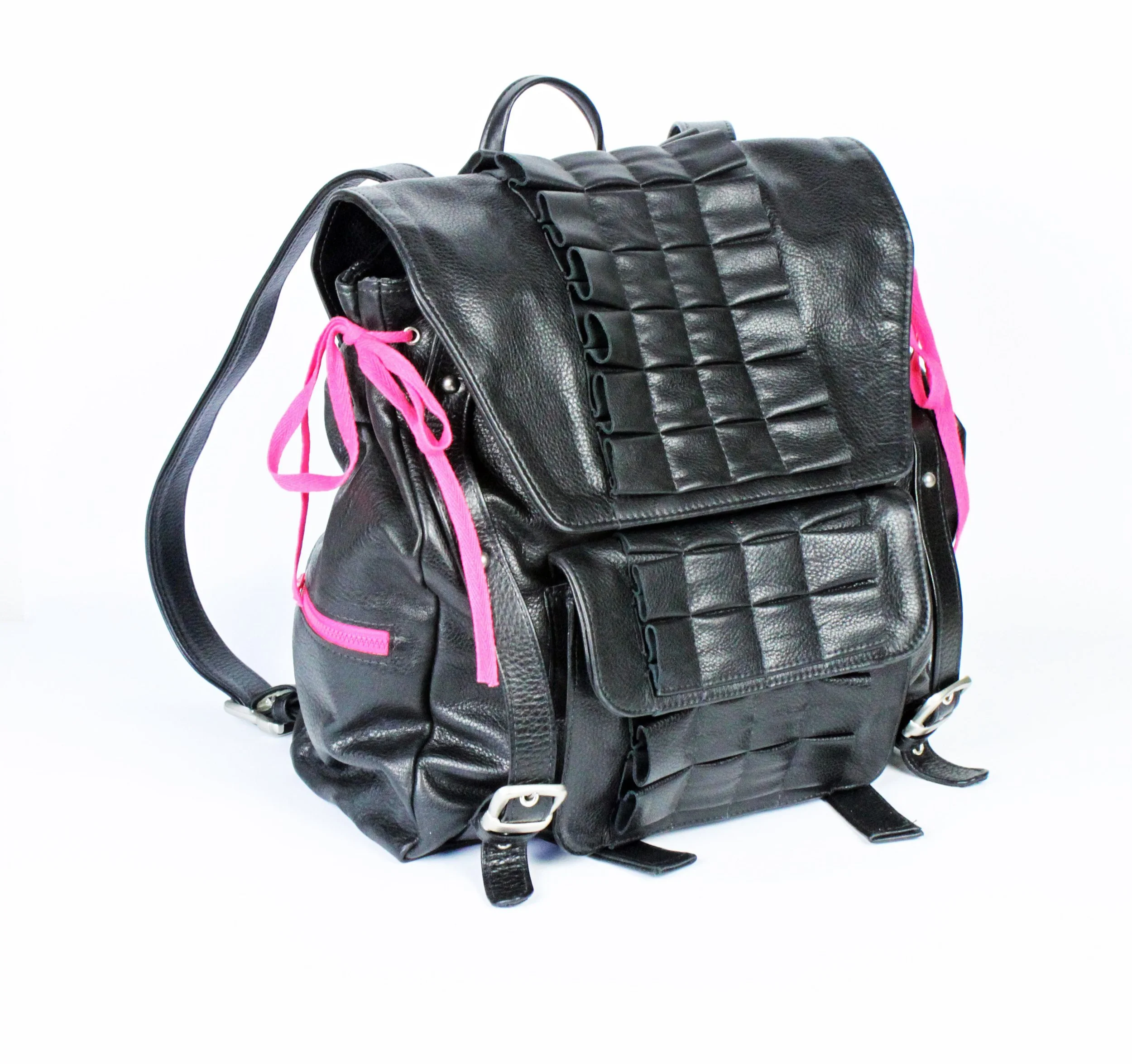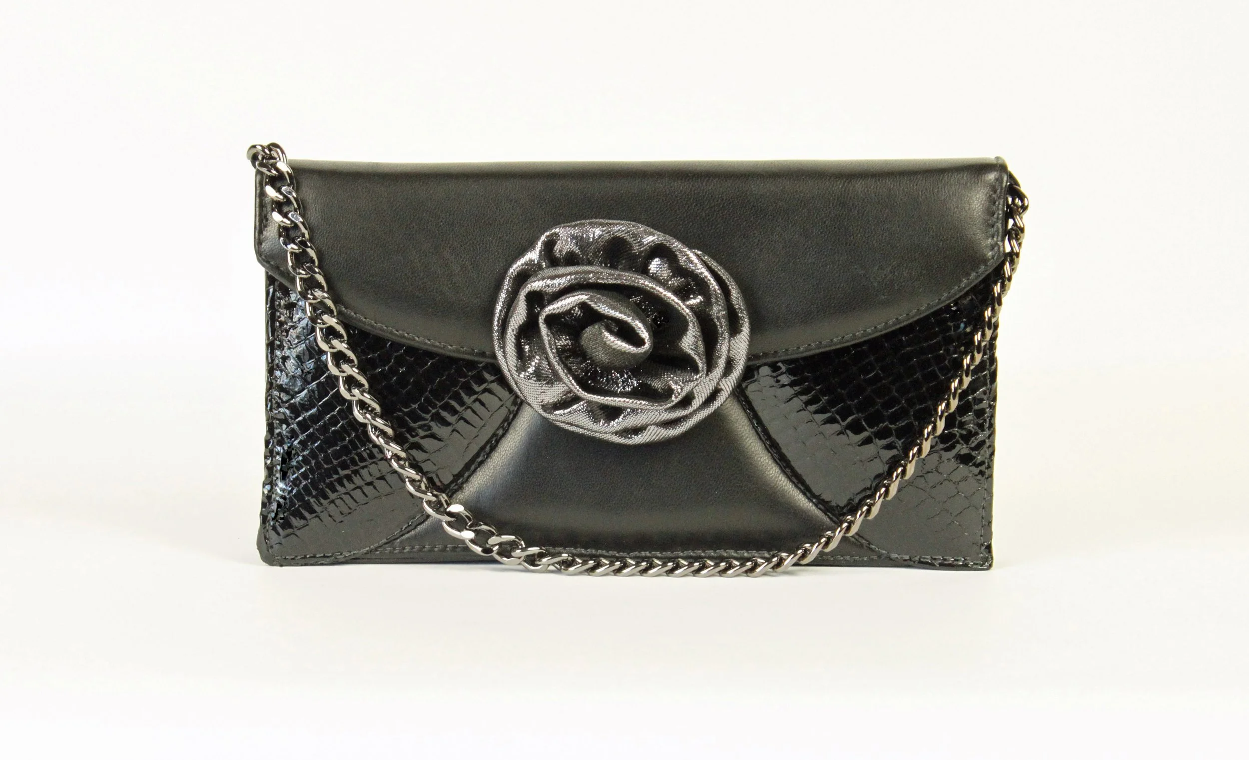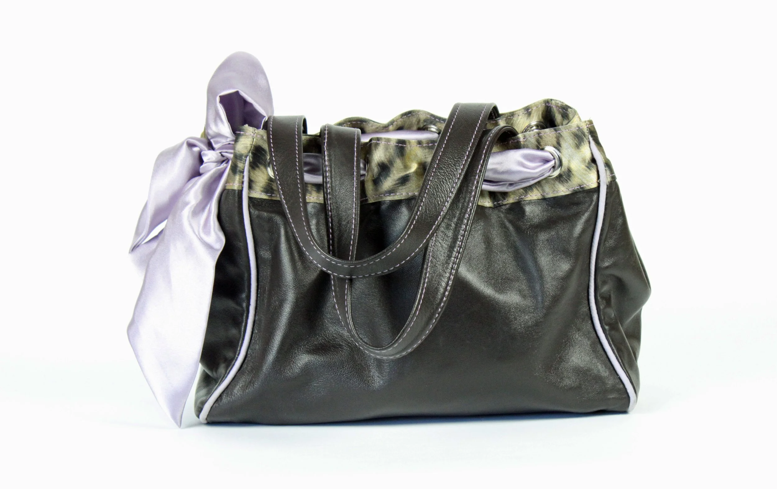 BAG CONSTRUCTIONS FROM LEFT TO RIGHT: T-BOTTOM TOTE WITH BOW EMBELLISHMENT. SELF-LINED CLUTCH WITH ZIPPER AND BOW EMBELLISHMENT. U-GUSSET SHOULDER BAG. SELF-LINED CLUTCH WITH BOW EMBELLISHMENT. T-BOTTOM TOTE WITH RUCHED EMBELLISHMENT.
